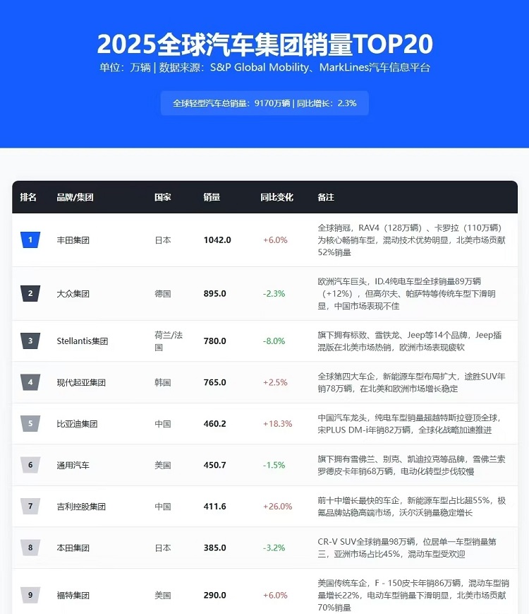 前两天,有媒体公布了2025年全球汽车集团销量top20榜单。