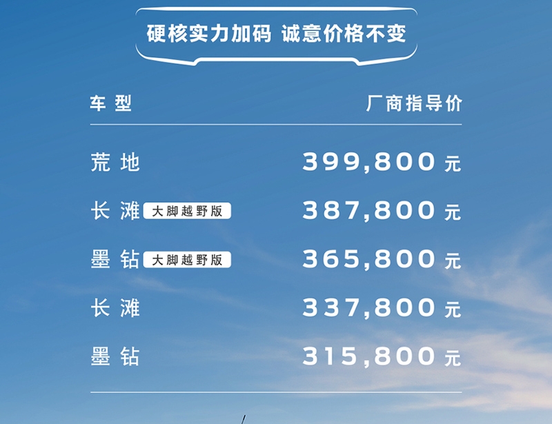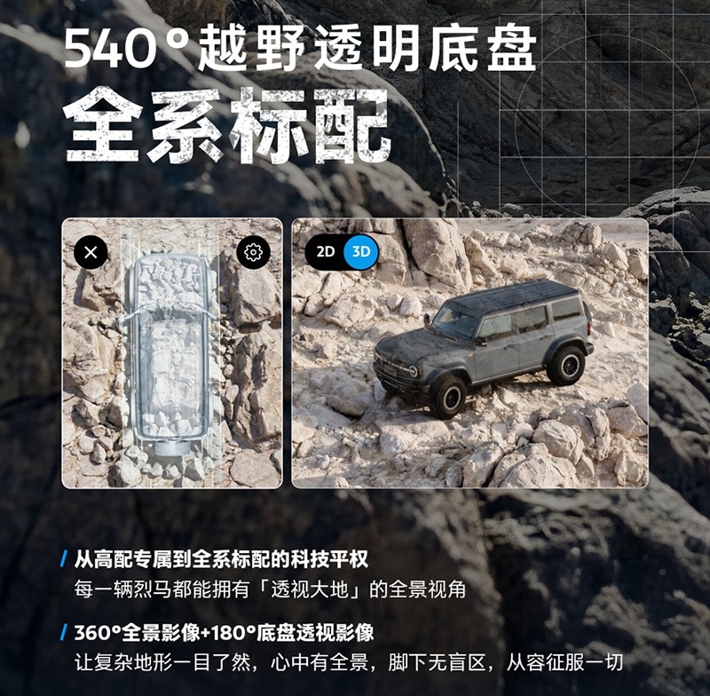 配置方面,新车将全系标配540°透明底盘,并提供原厂35英寸大脚及可断开防倾杆。